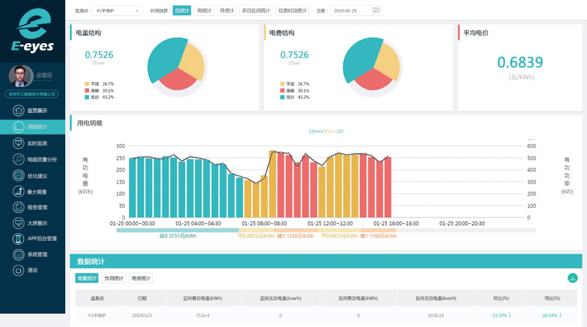 針對企業(yè)不同監(jiān)測點、不同時間尺度(15分鐘、小時、日、周、月、任意區(qū)間)的有功電量、負荷曲線、電價、電費等進 行展示和統(tǒng)計分析,并提供數(shù)據(jù)一鍵導出服務(wù),幫助企業(yè)實現(xiàn)用能的精細化管理。
